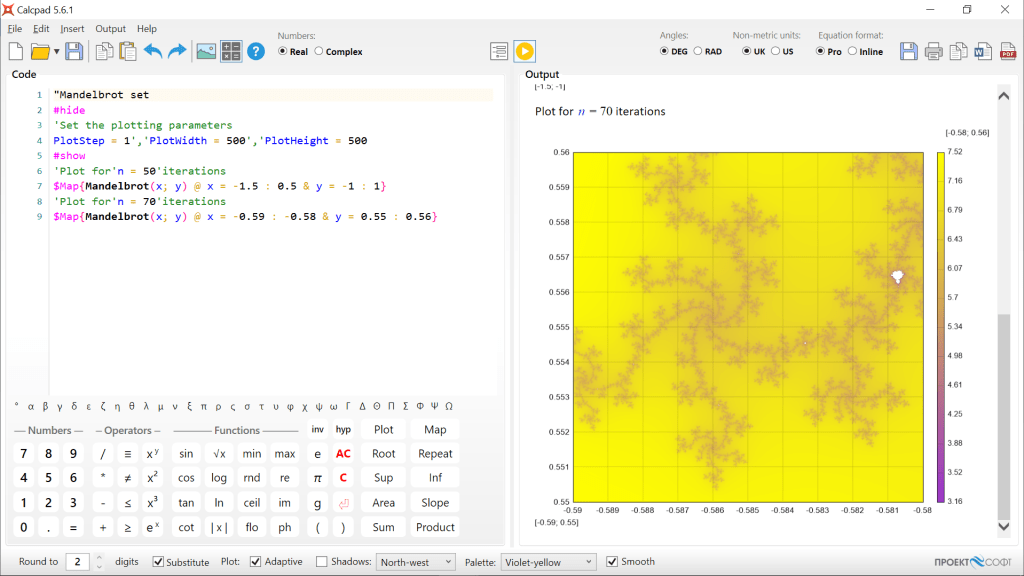 The only problem with this method is that it is slow and elaborate. That is why, I included a special function Mandelbrot(x; y) in Calcpad. It calculates the number of iterations, needed for the modulus to overpass 2. You can plot this function directly with the preferred color scale: